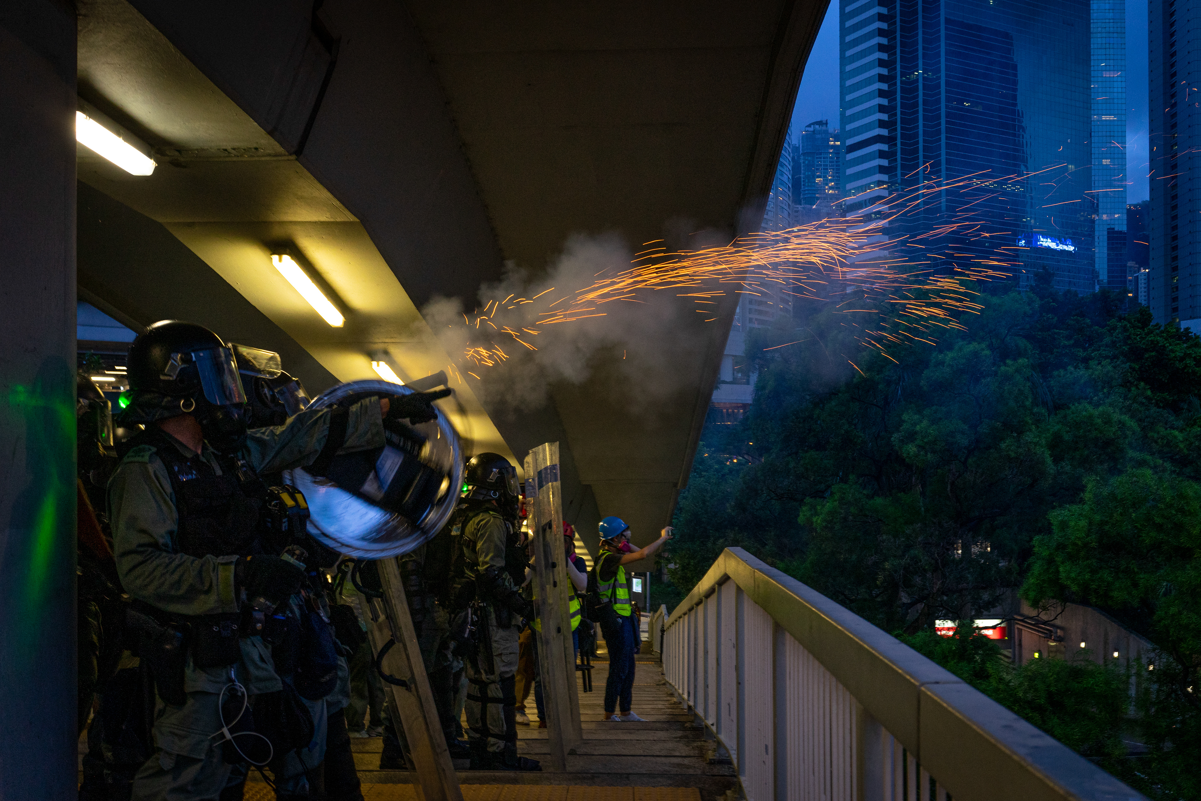 Tear Gas: Admiralty, Hong Kong: Riot police fire tear gas at a group of protestors on an adjacent footbridge. Protests today marked the 5th anniversary of the Chinese government's refusal of universal suffrage for Hong Kongers. The initial refusal was the impetus for the Umbrella Movement protests in 2014. August 31, 2019-Hong Kong