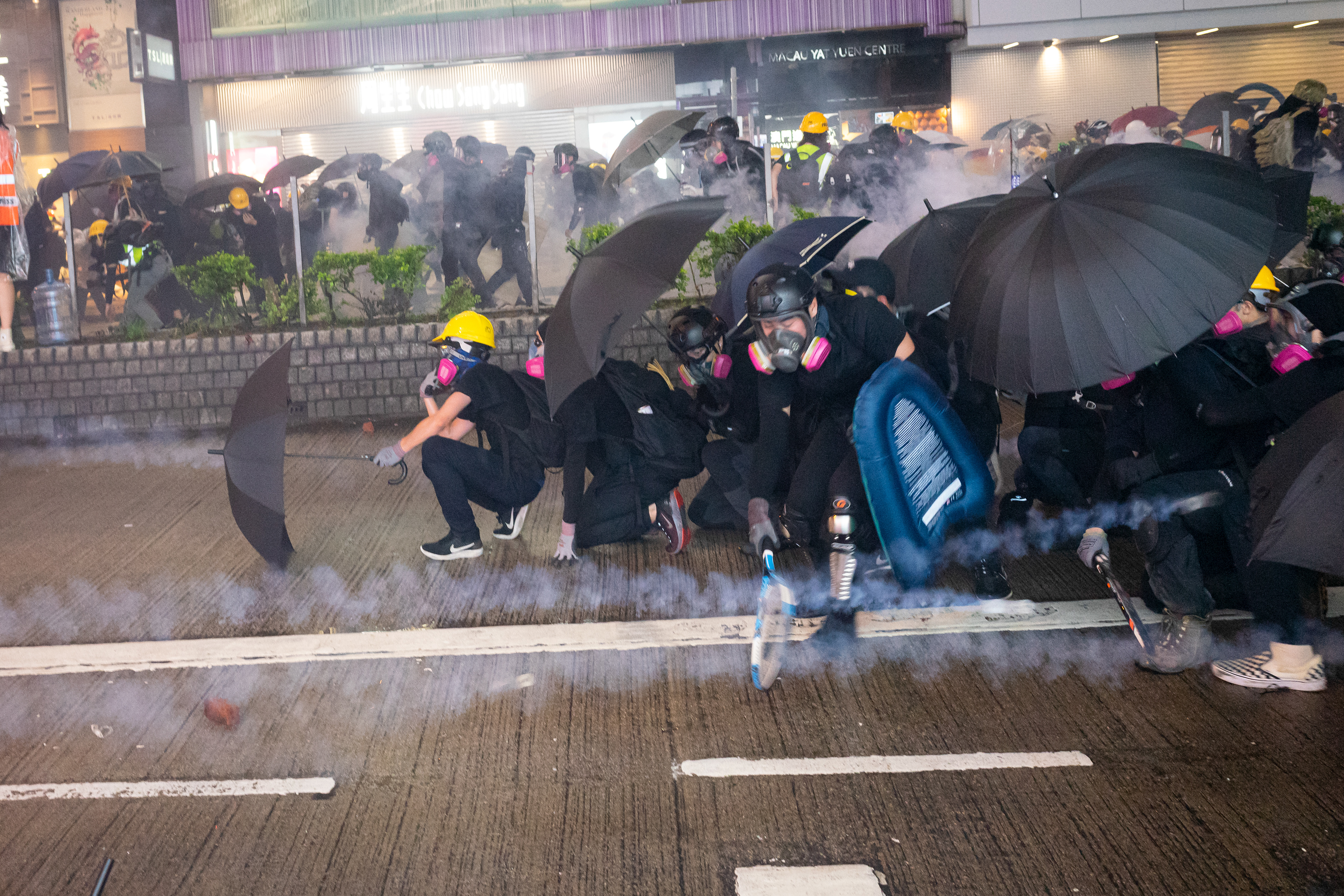 Small Team: Causway Bay, Hong Kong: A small group takes the lead in confronting riot police as tear gas rains down. The August 31st protests marked the 5th anniversary of the Chinese governments refusal of universal suffrage for Hong Kongers. The initial refusal was the impetus for the Umbrella Movement protests in 2014. August 31, 2019-Hong Kong